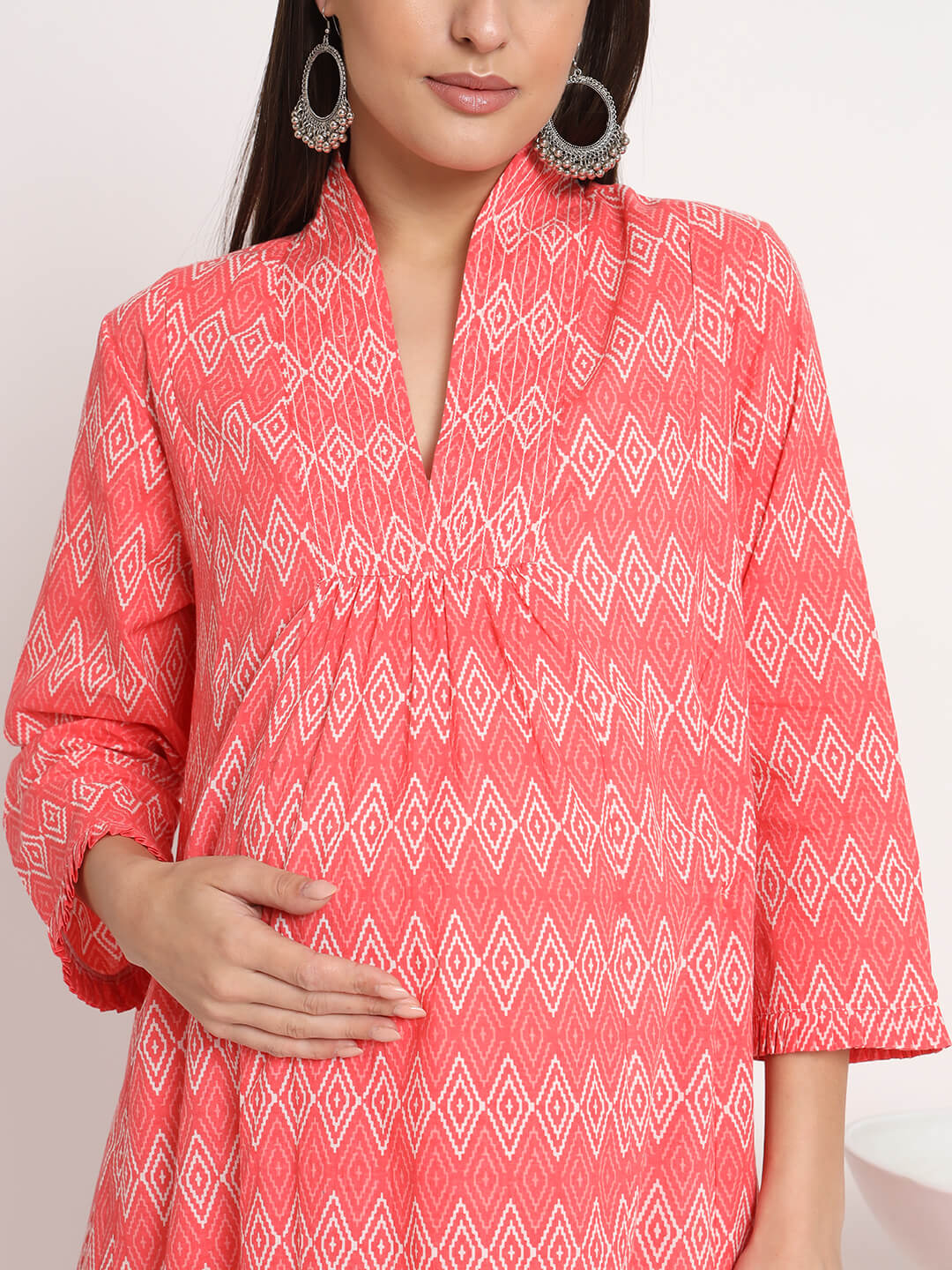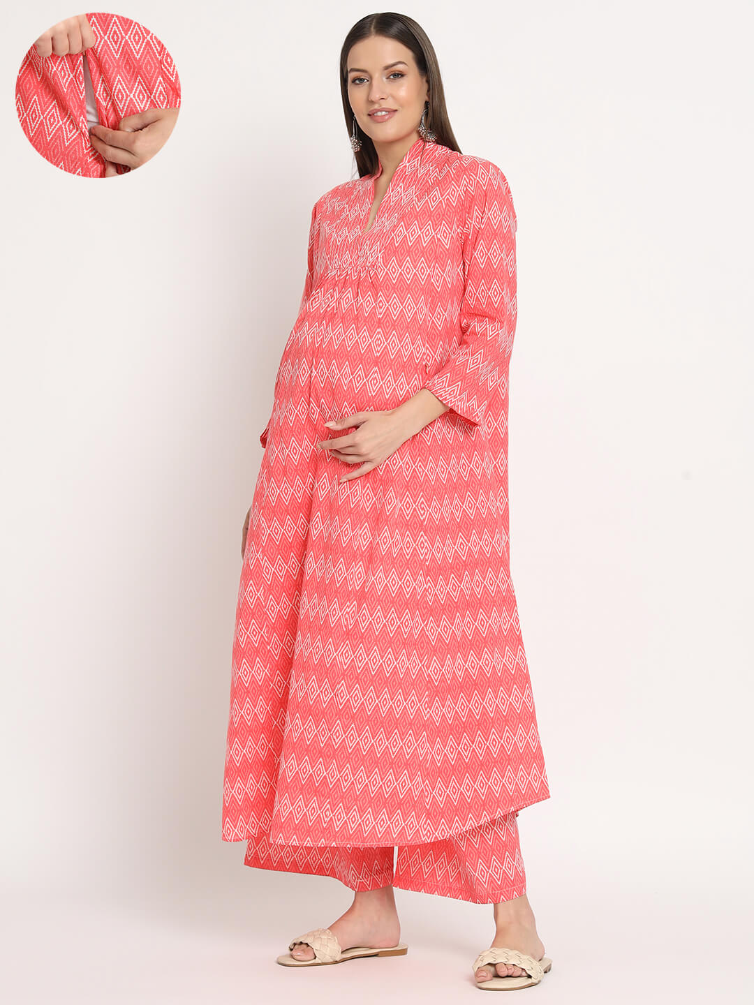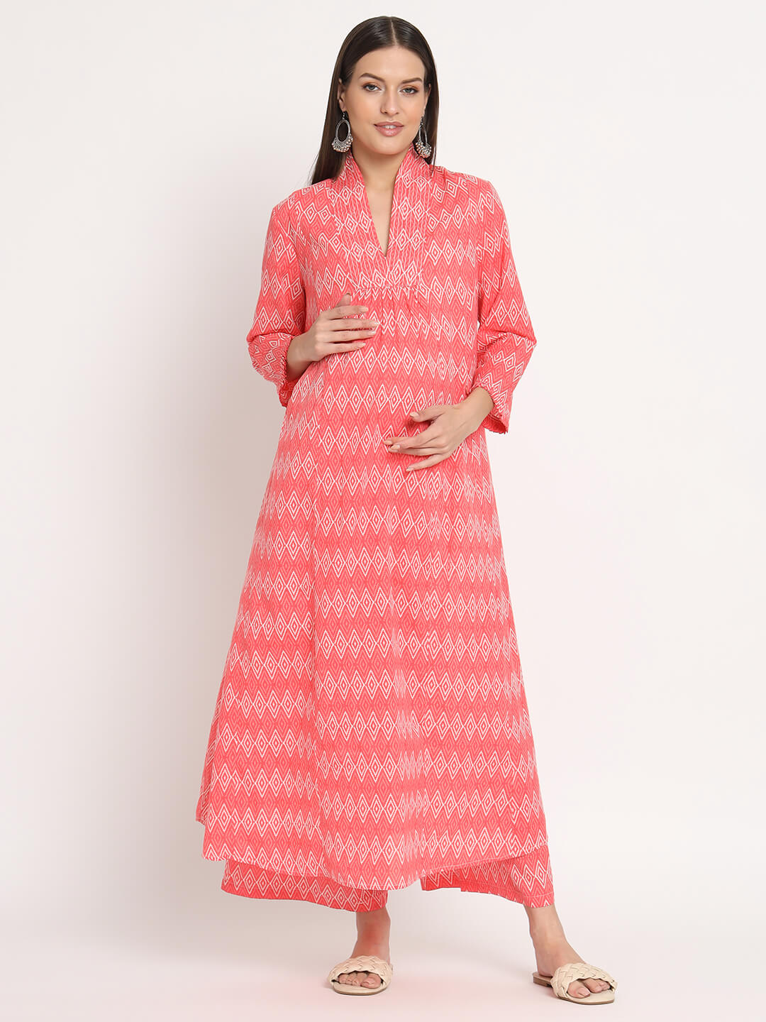 Peach Cotton Printed Maternity Feeding Kurta Set
