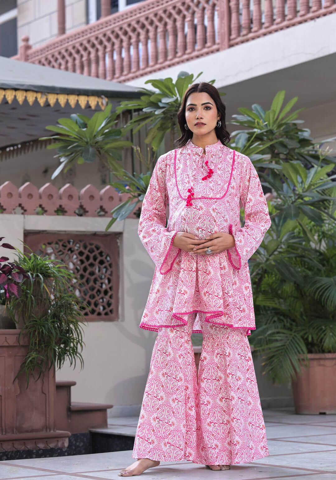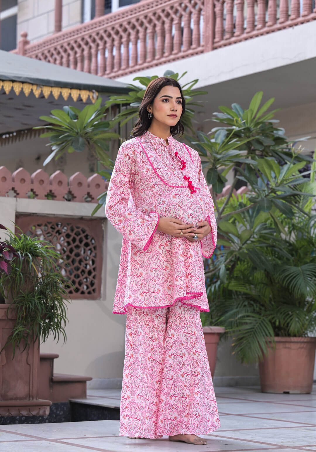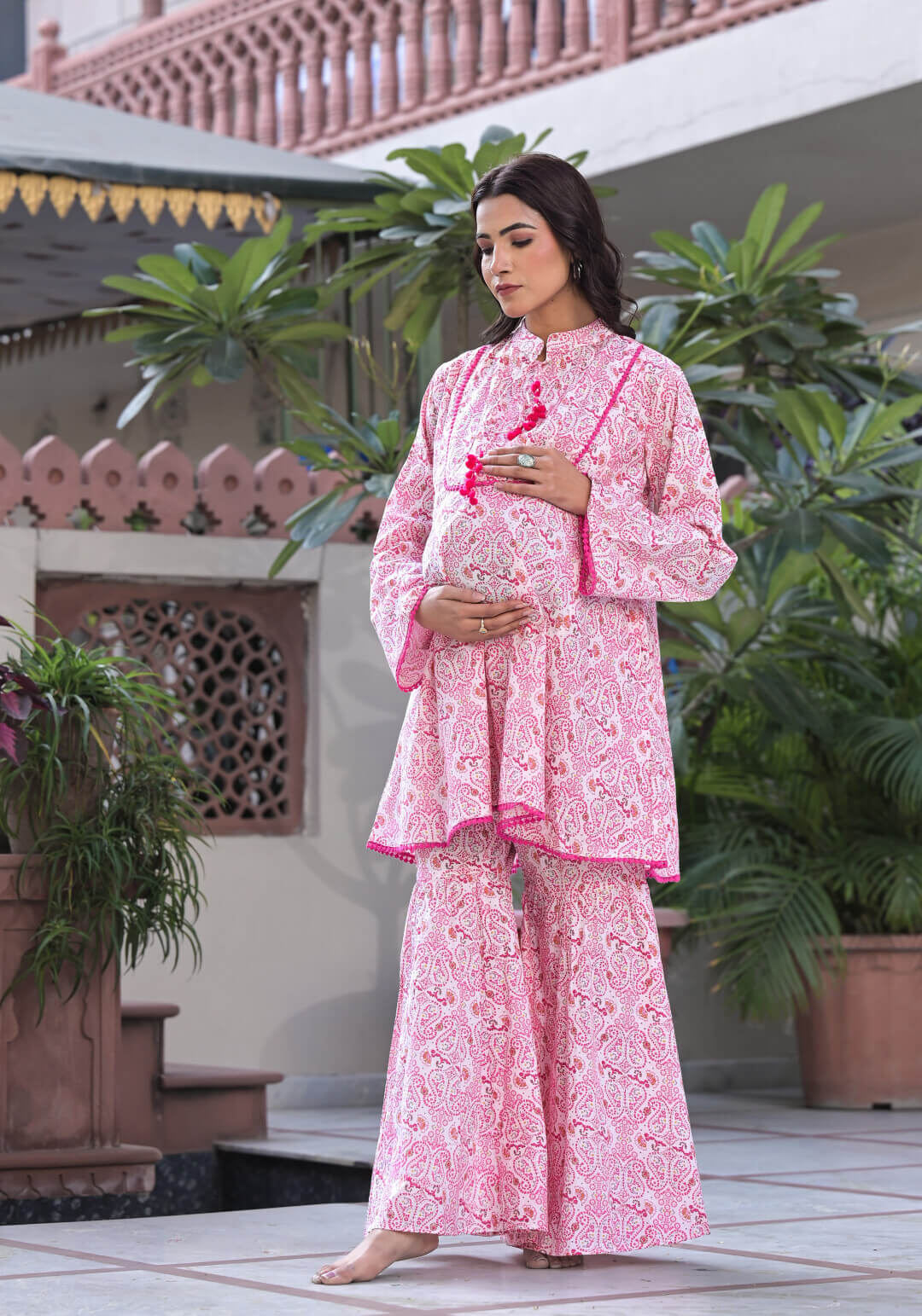 White Pink Cotton Printed Maternity Feeding Kurta Sharara Set