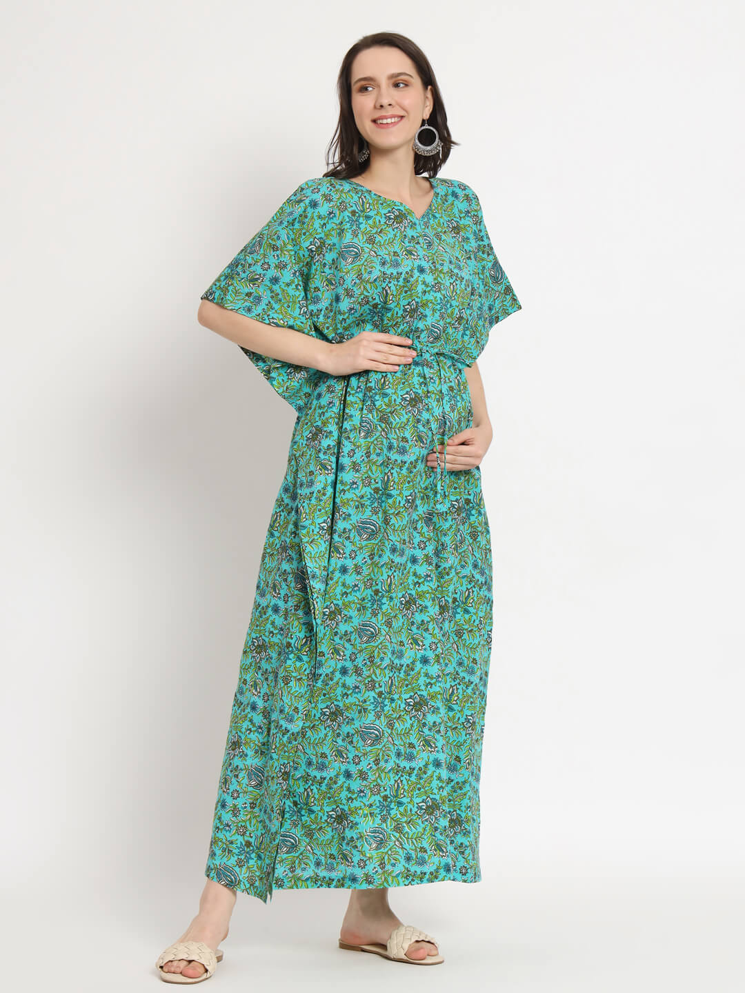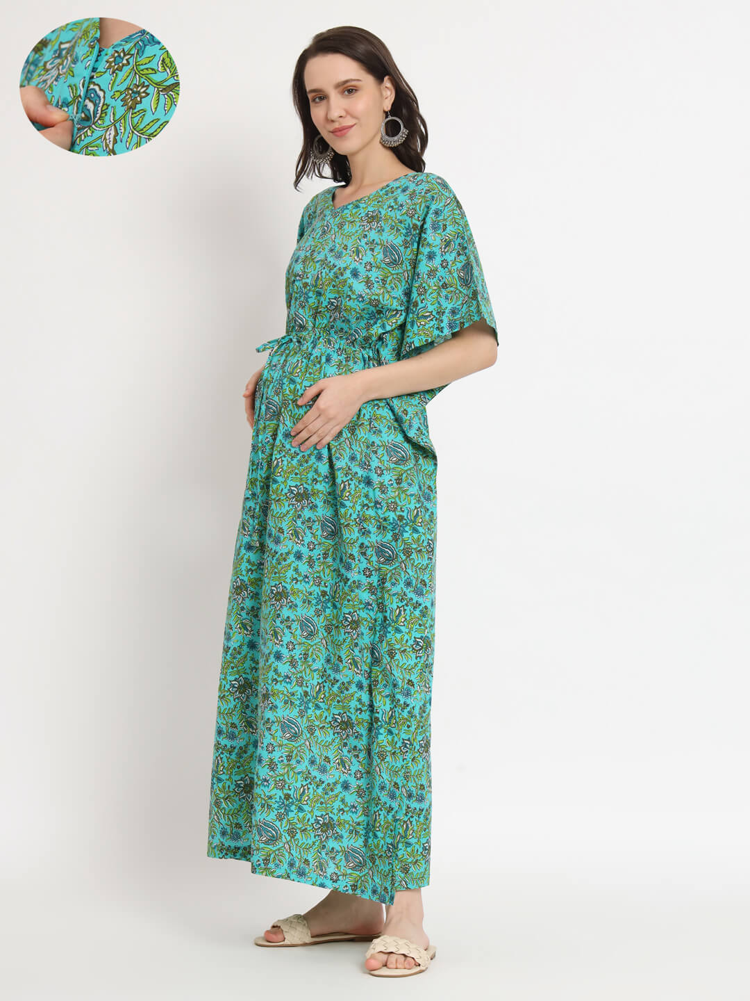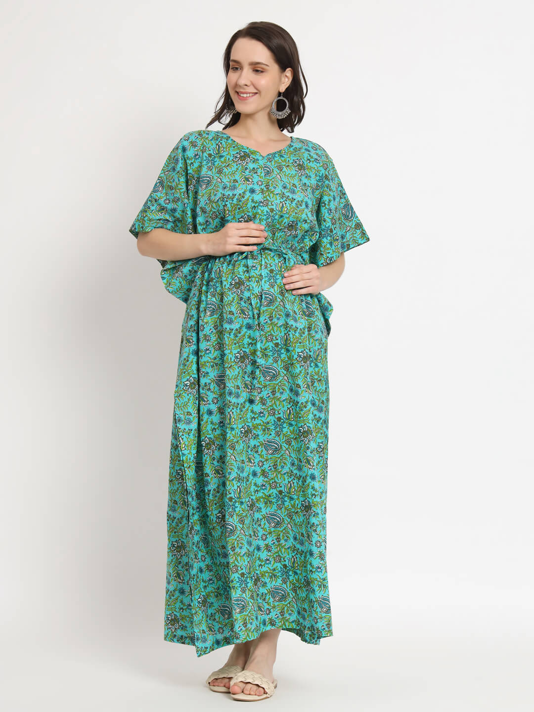 Sea Green Printed Front Zipper Maternity Feeding Kaftan