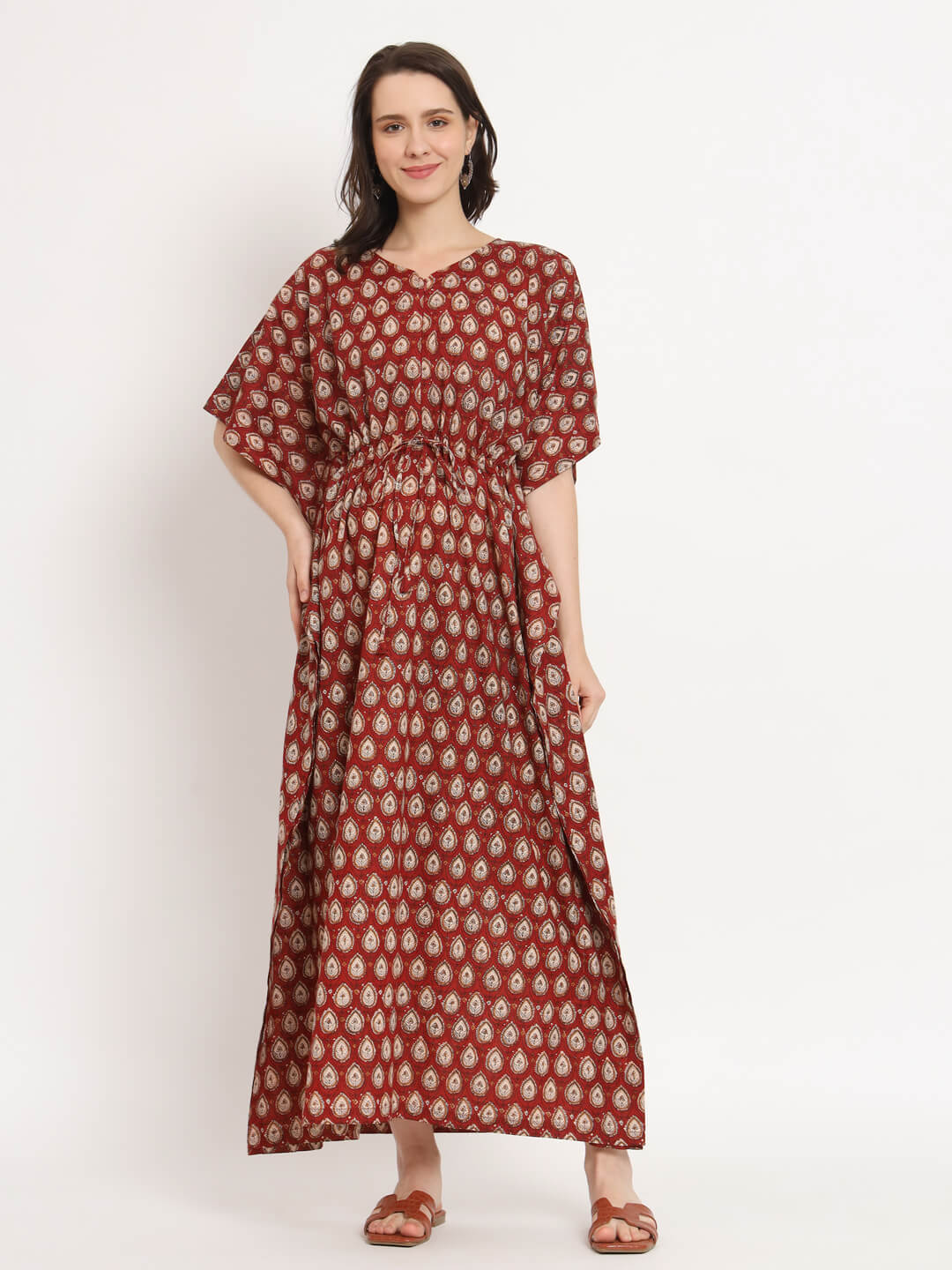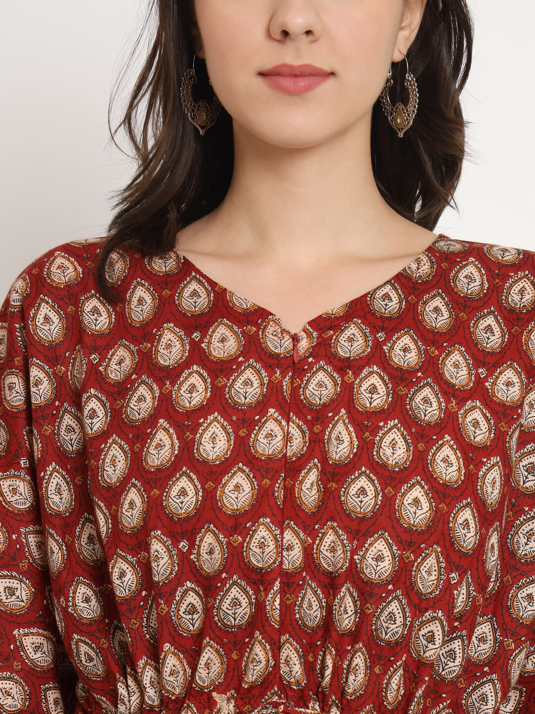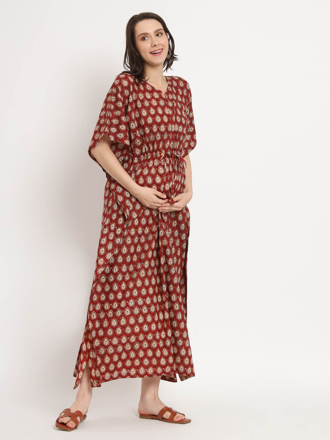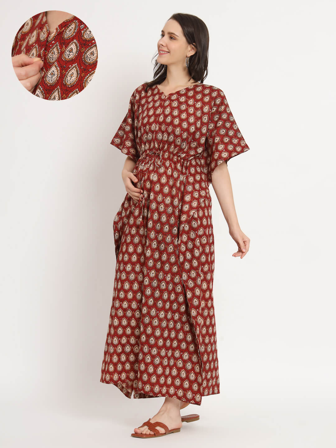Maroon Printed Front Zipper Maternity Feeding Kaftan