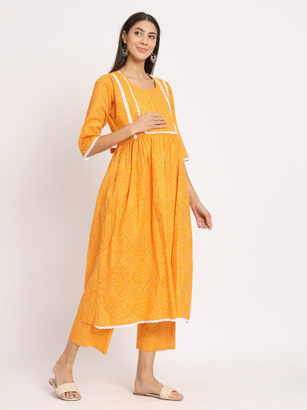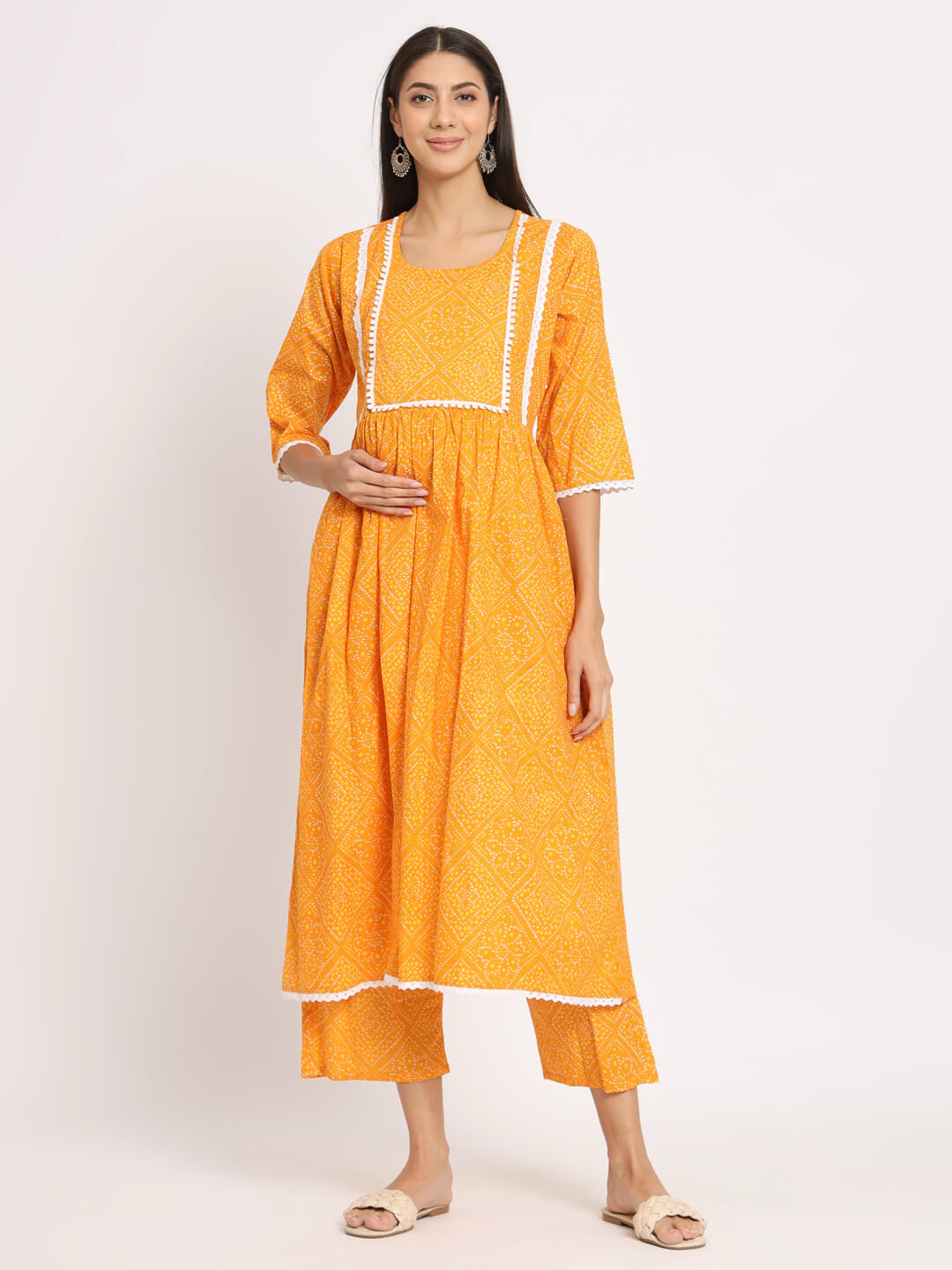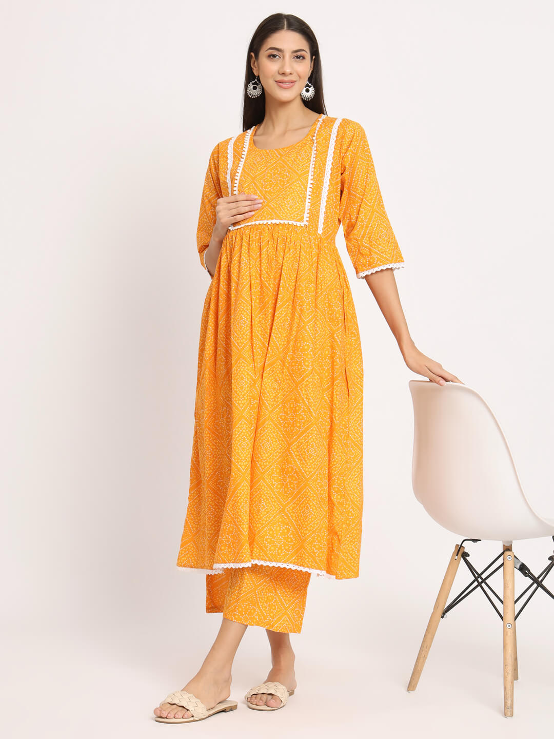 Mustard Cotton Printed Maternity Feeding Kurta Set