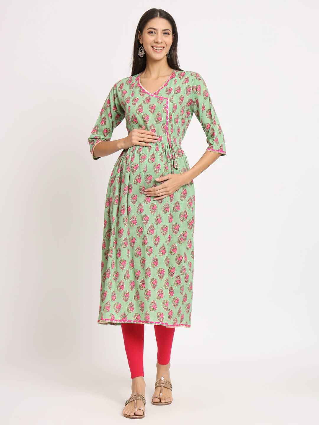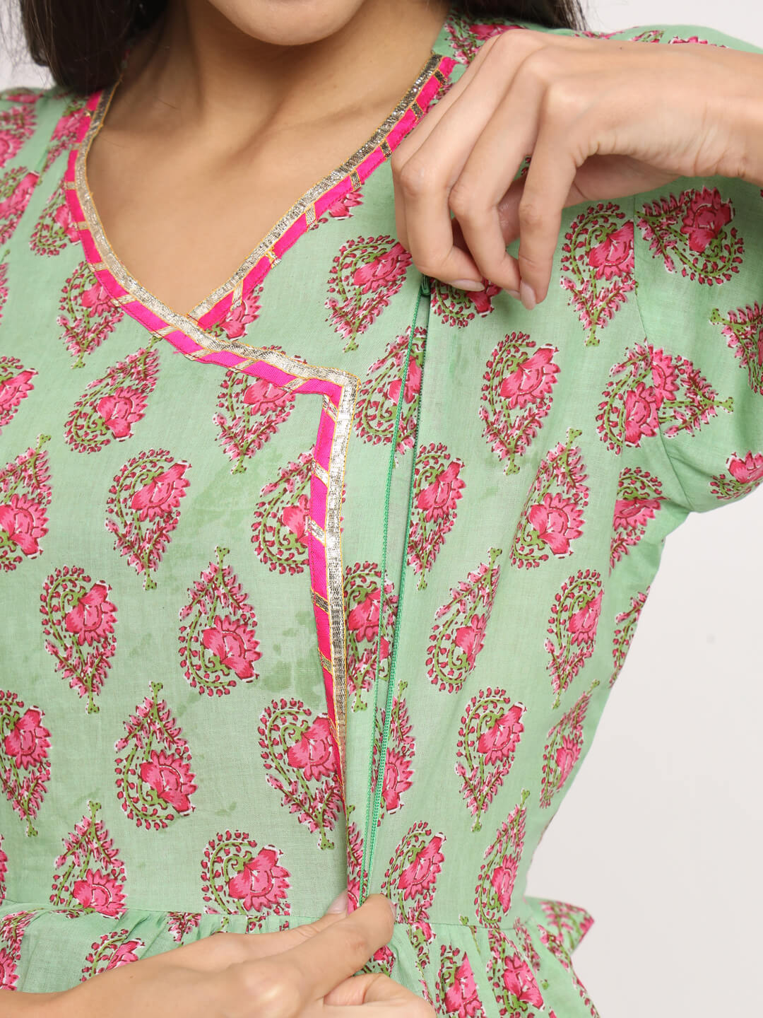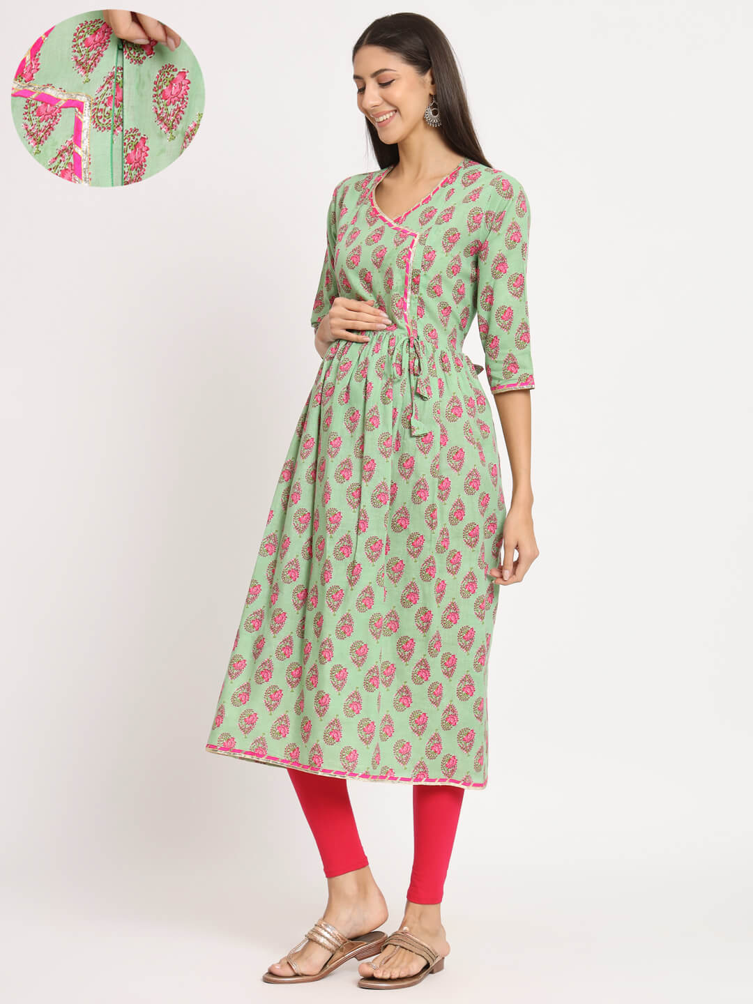 Mint Green Cotton Printed Maternity Feeding Kurta