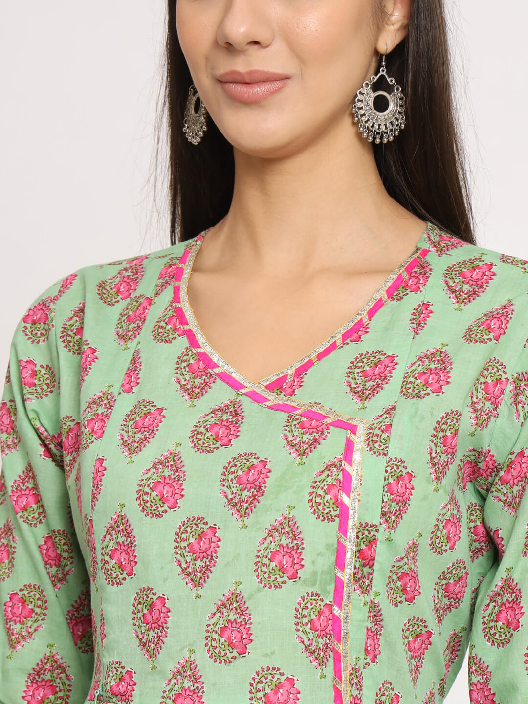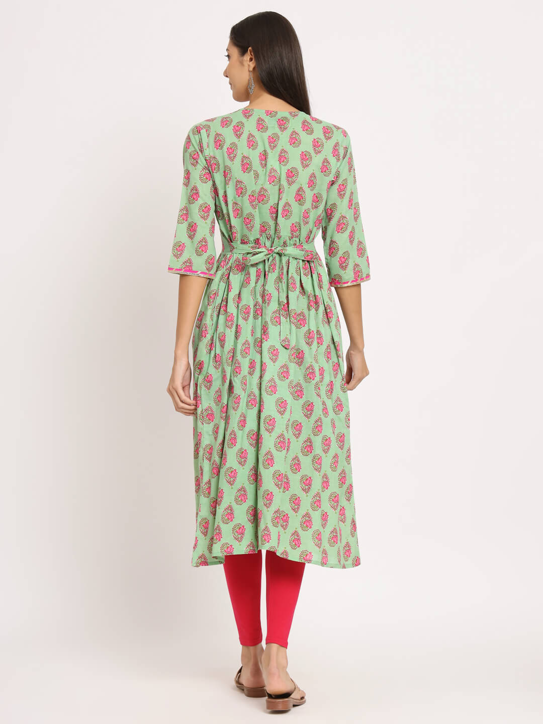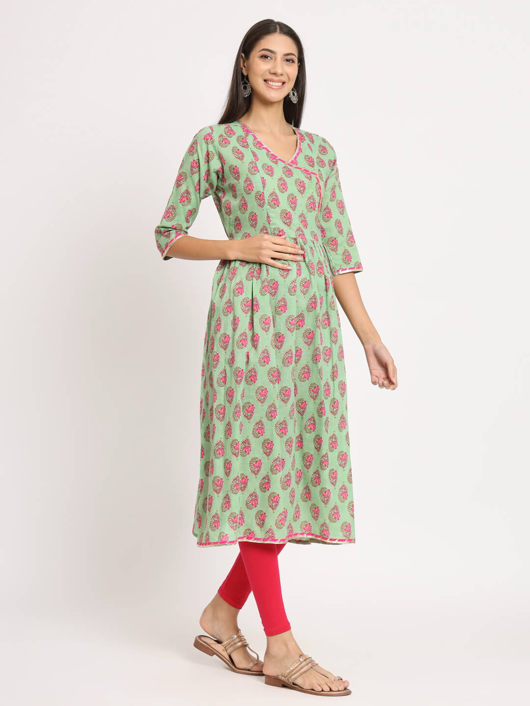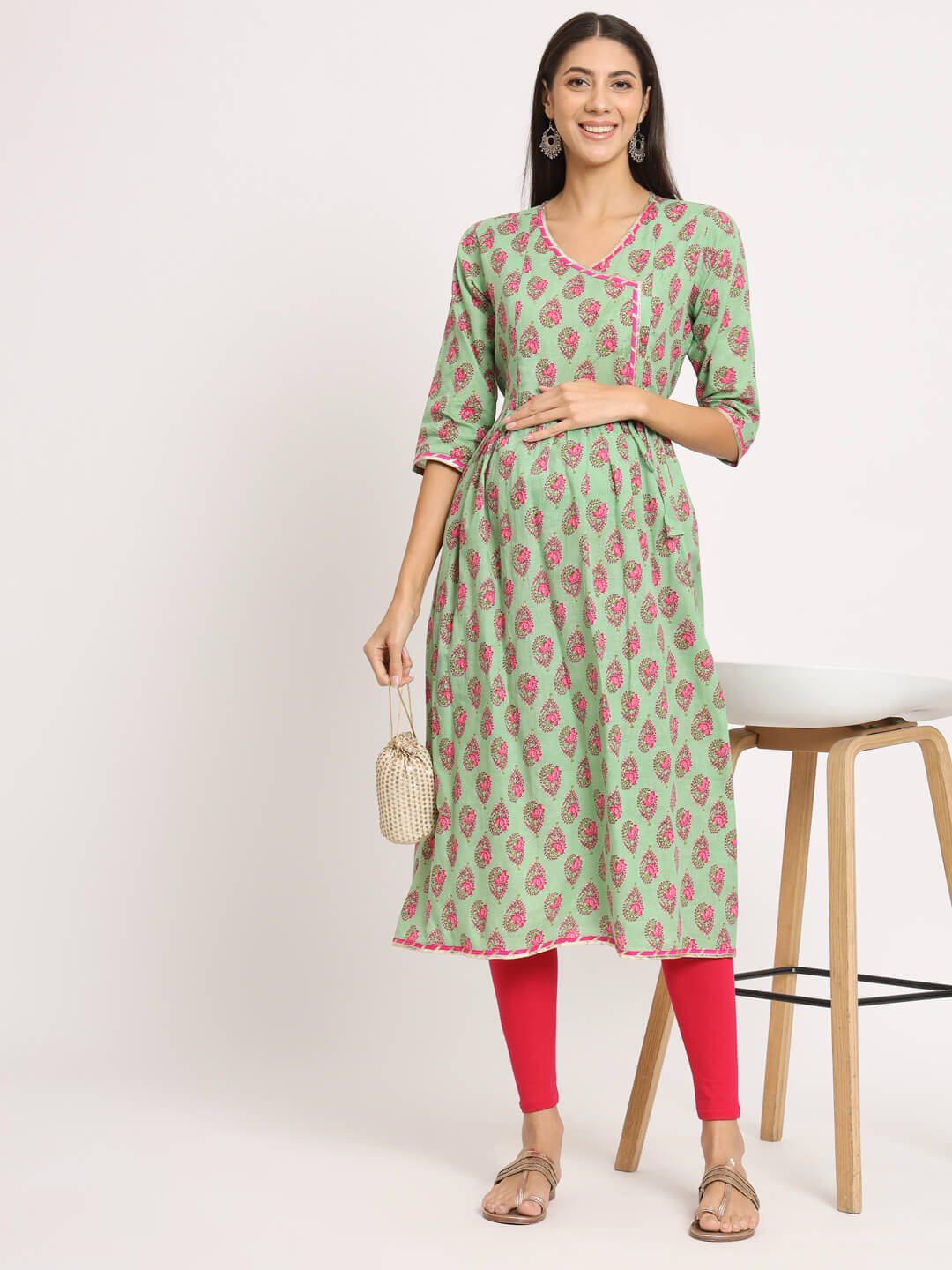 Mint Green Cotton Printed Maternity Feeding Kurta