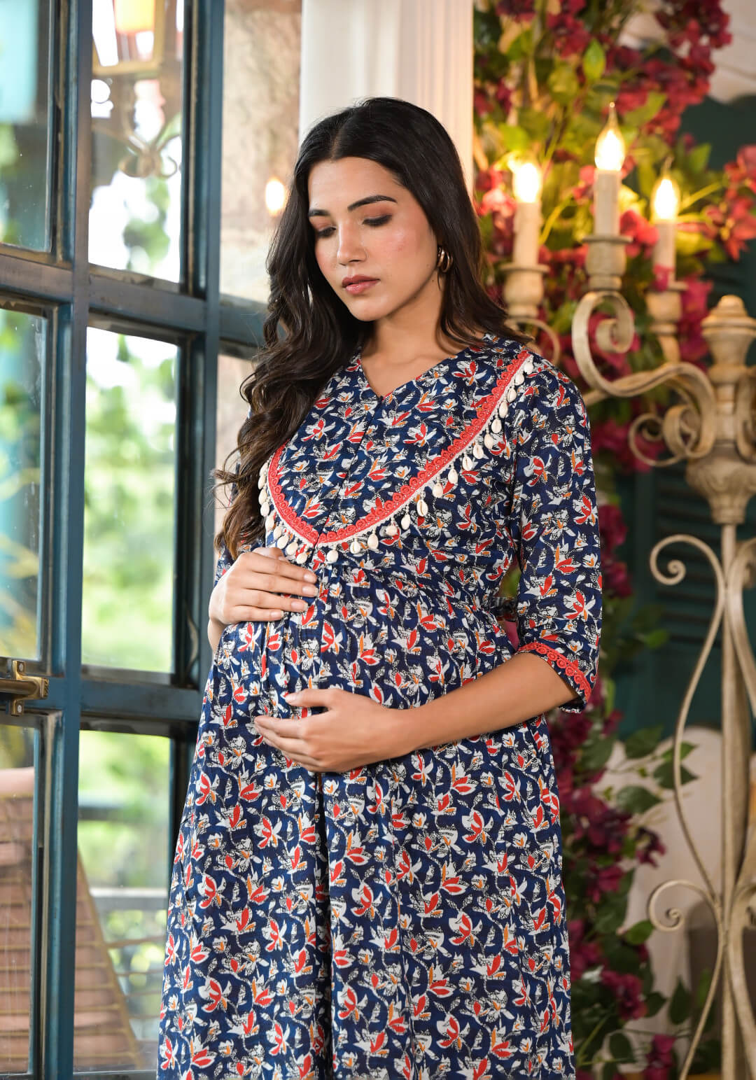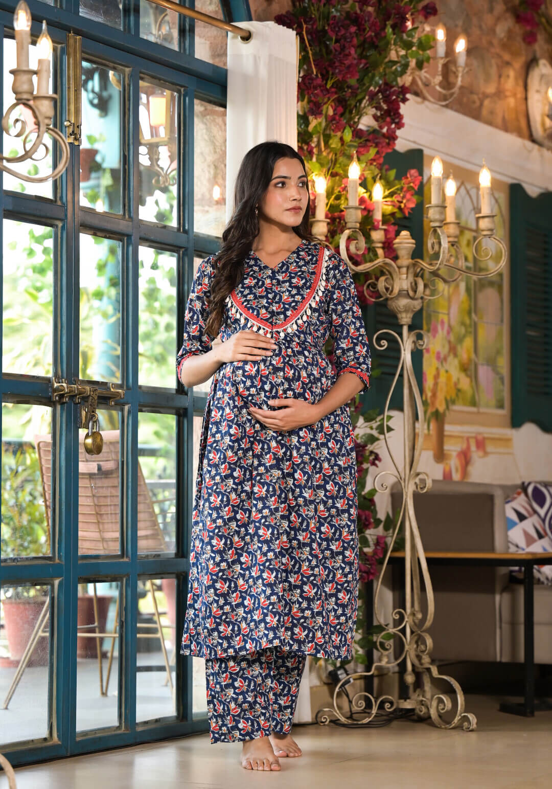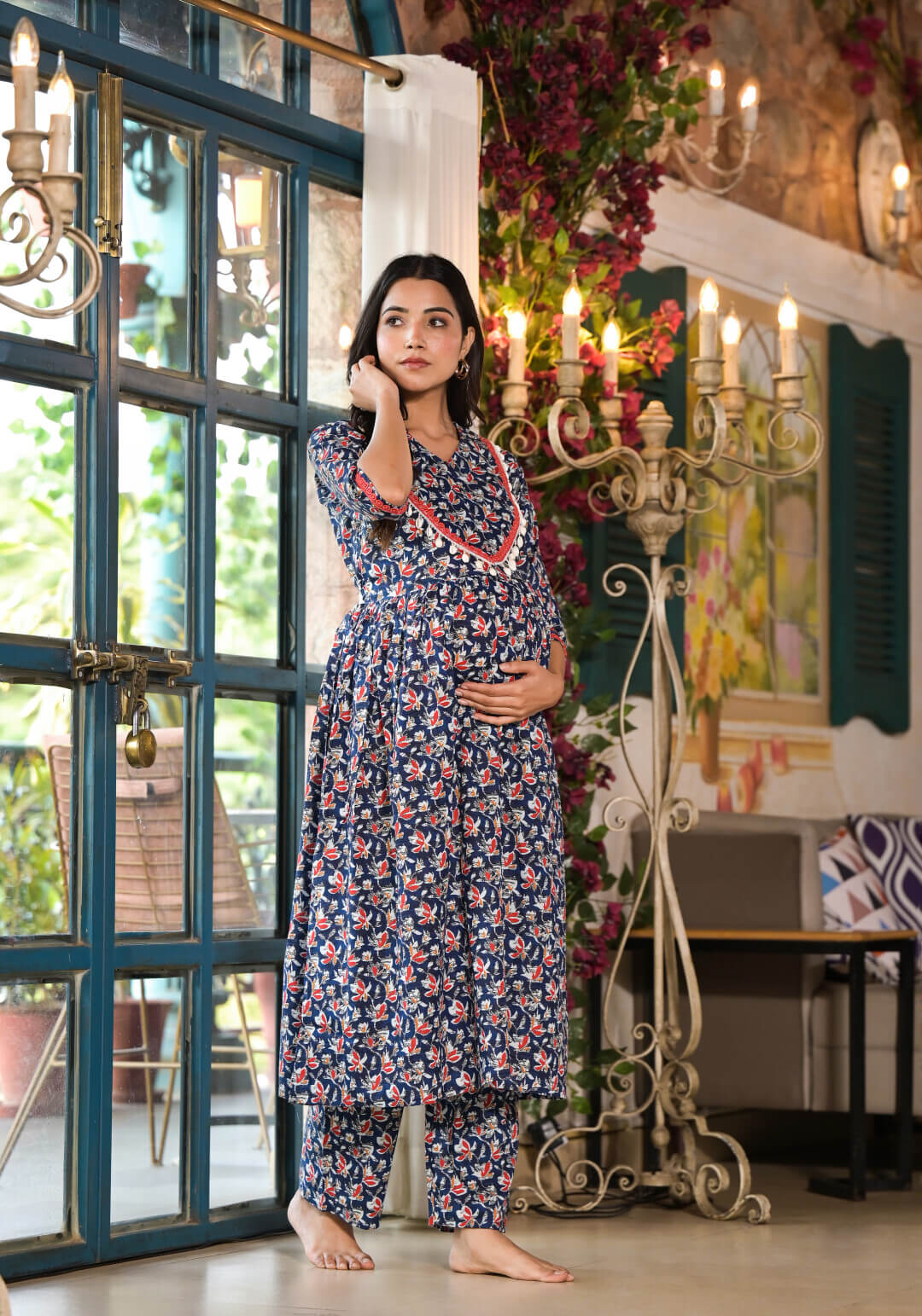 Indigo Multi Cotton Printed Maternity Feeding Kurta Set