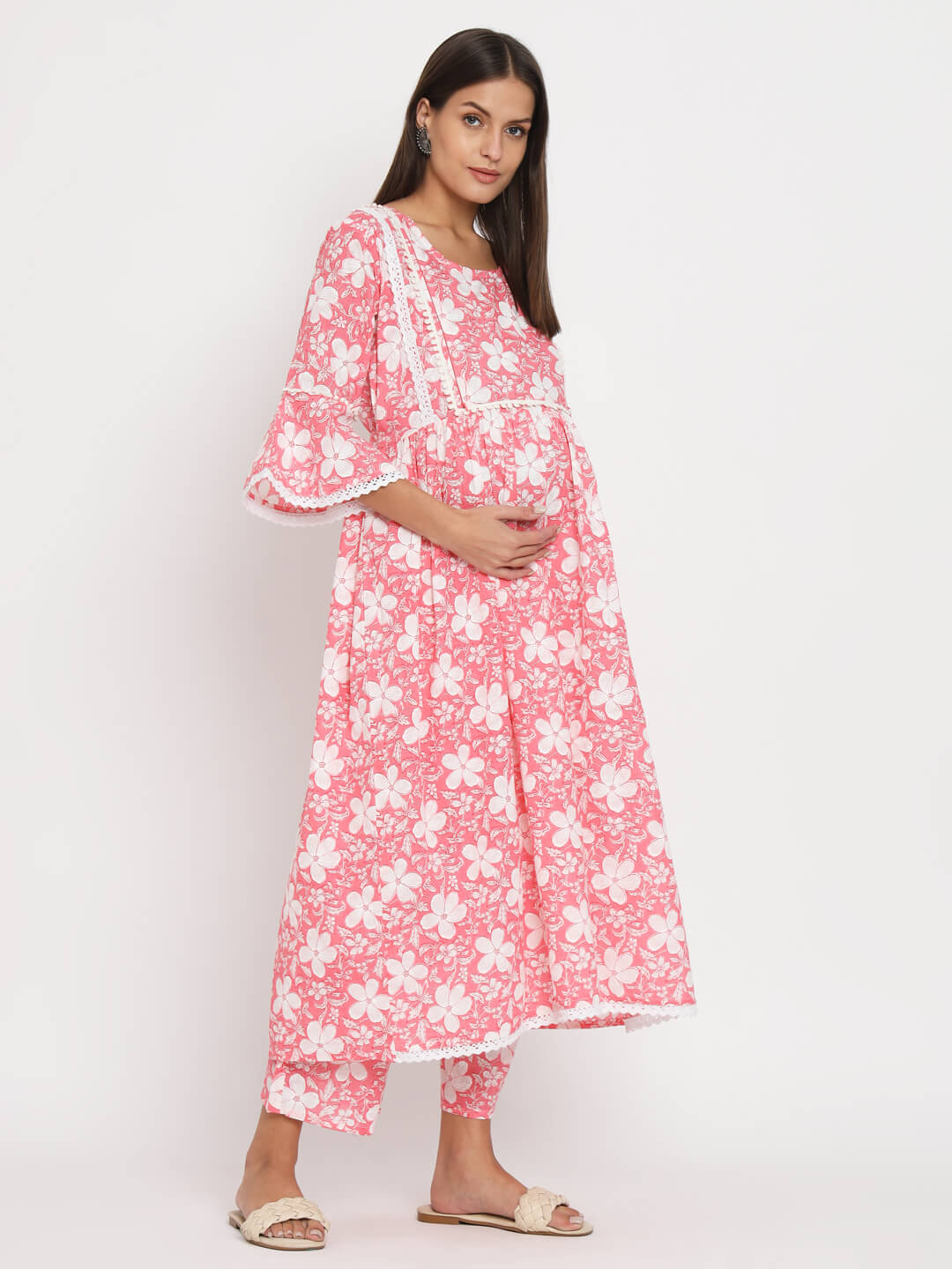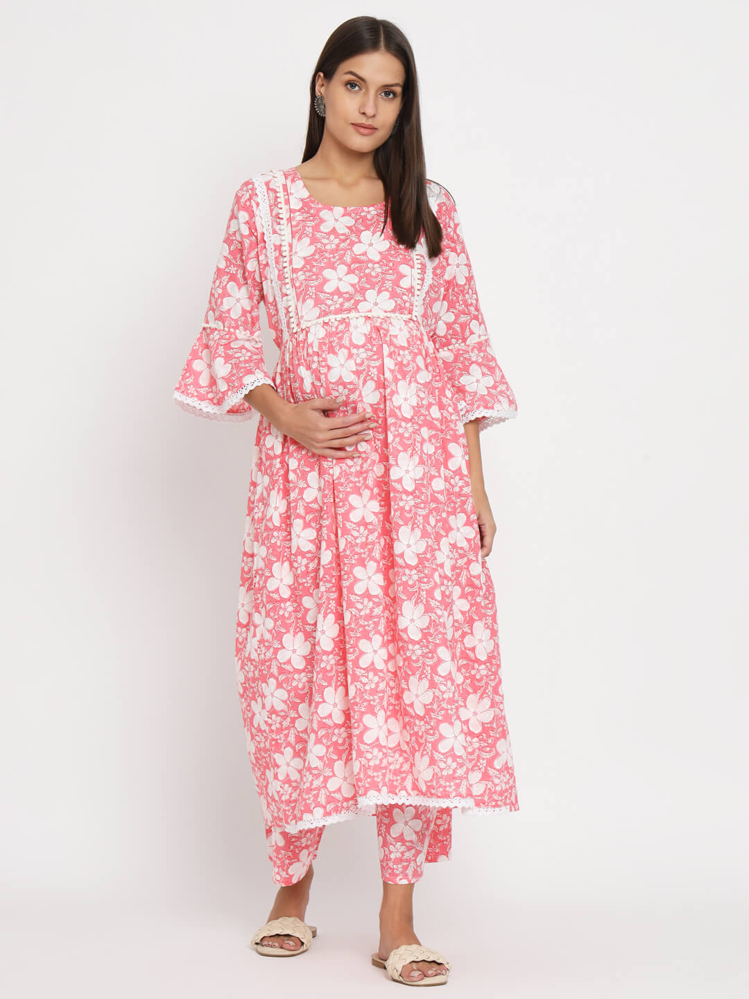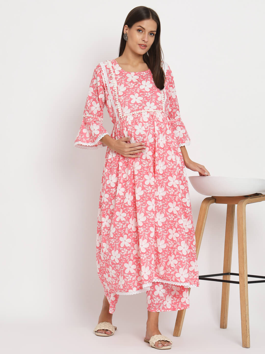 Pink White Cotton Printed Maternity Feeding Kurta Set
