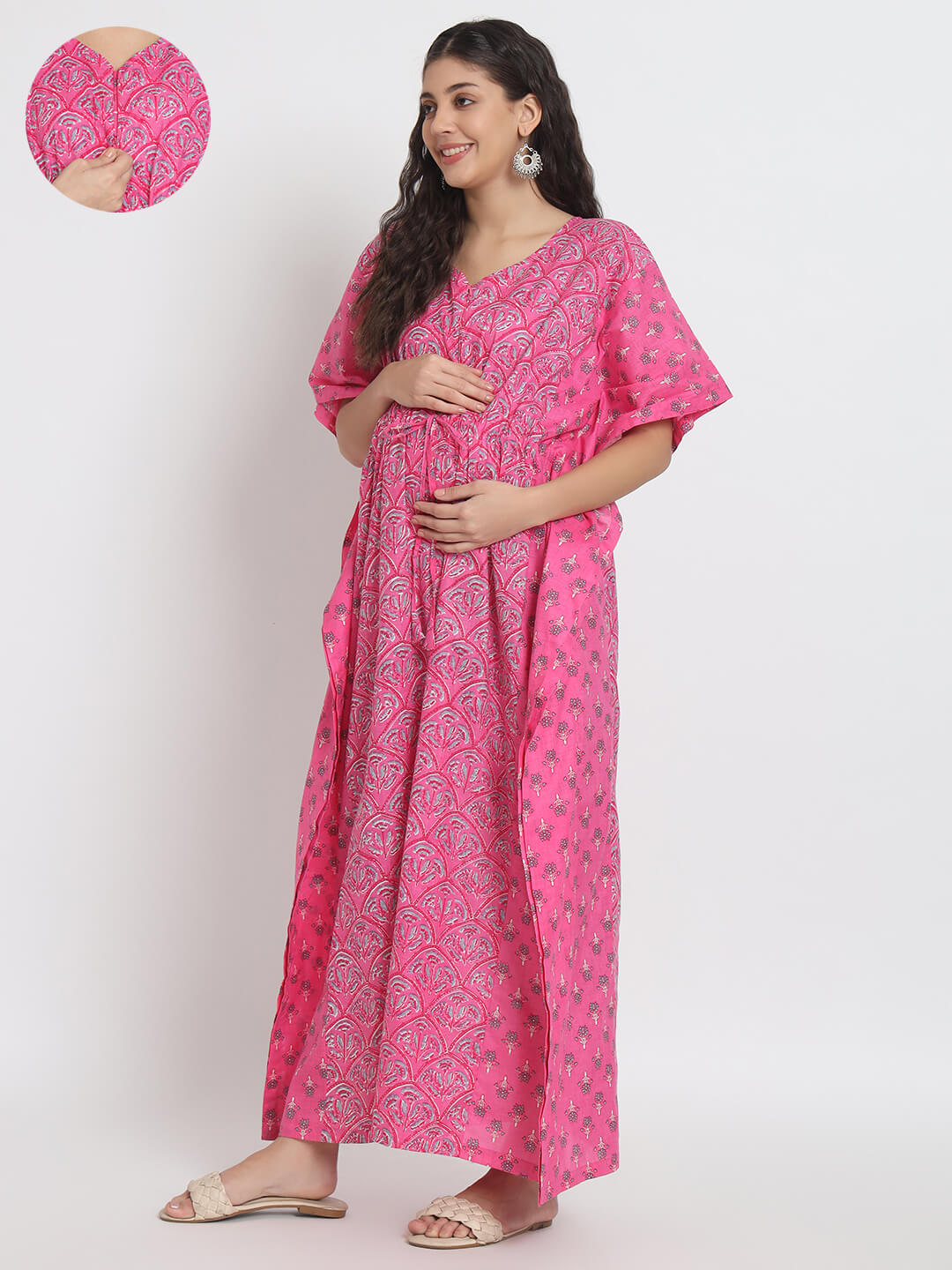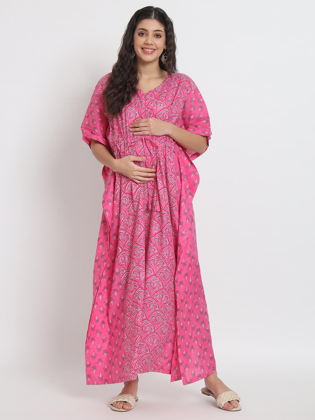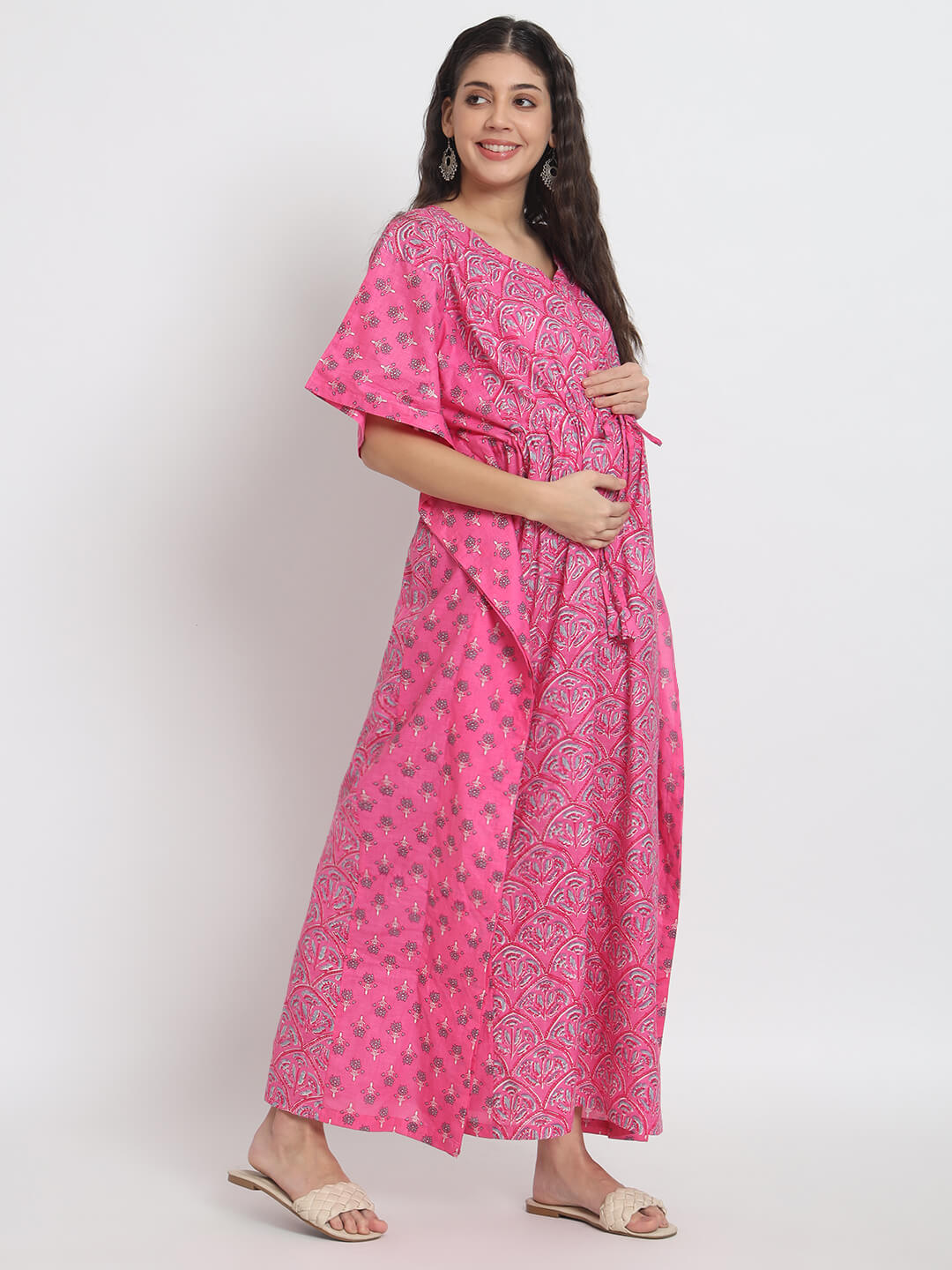 Pink Printed Front Zipper Maternity Feeding Kaftan
