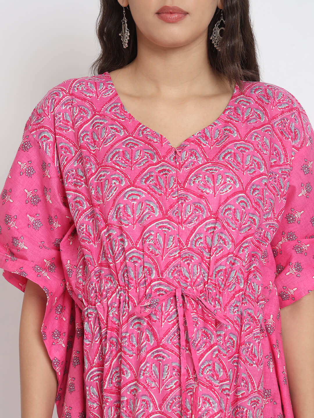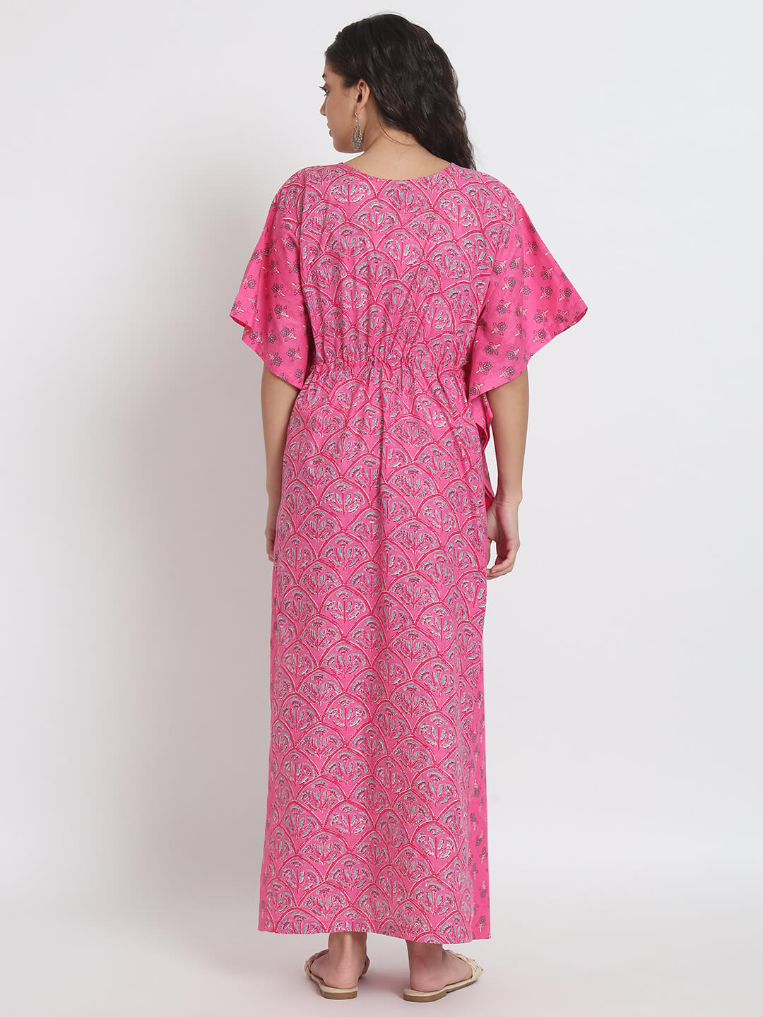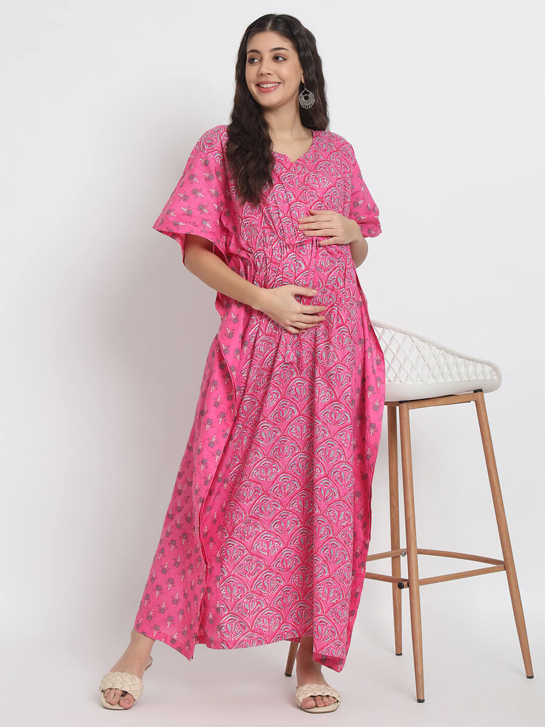 Pink Printed Front Zipper Maternity Feeding Kaftan