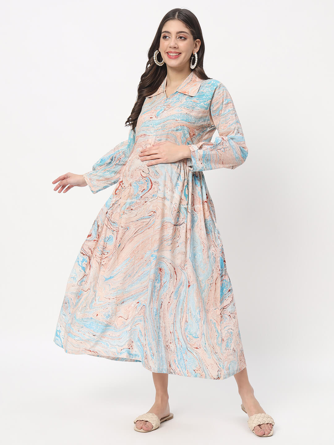 Turquoise Brown Marble Hand Printed Maternity Feeding Flared Dress