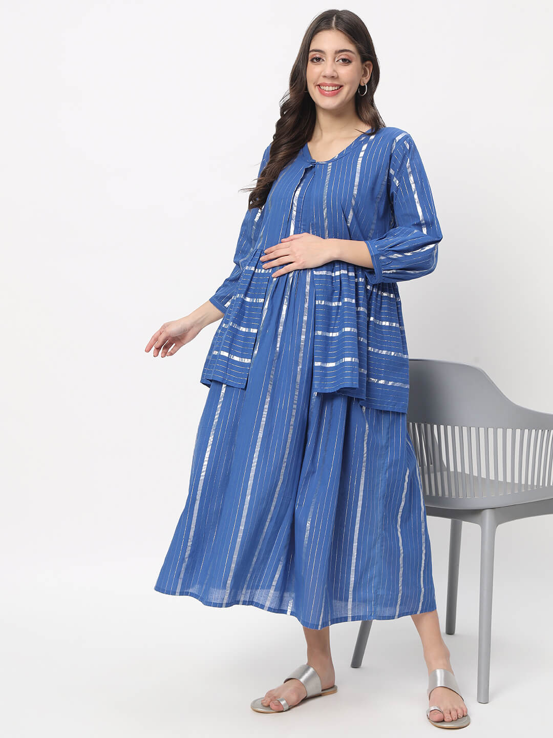 Blue Cotton Maternity Feeding Flared Jacket Dress