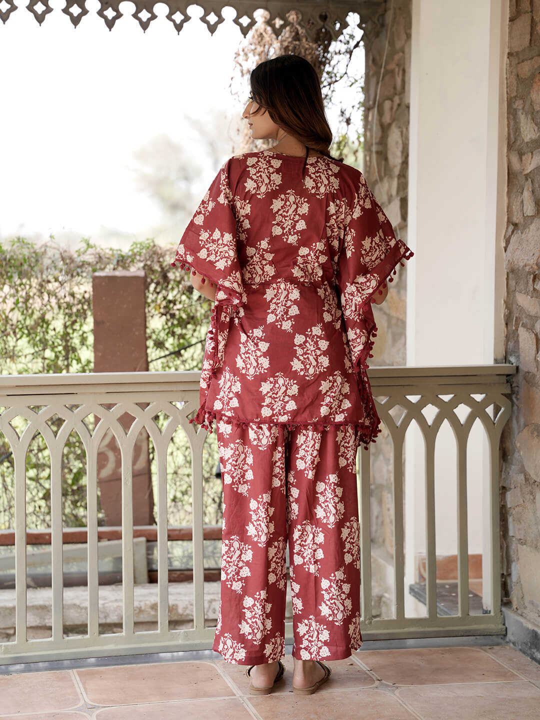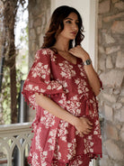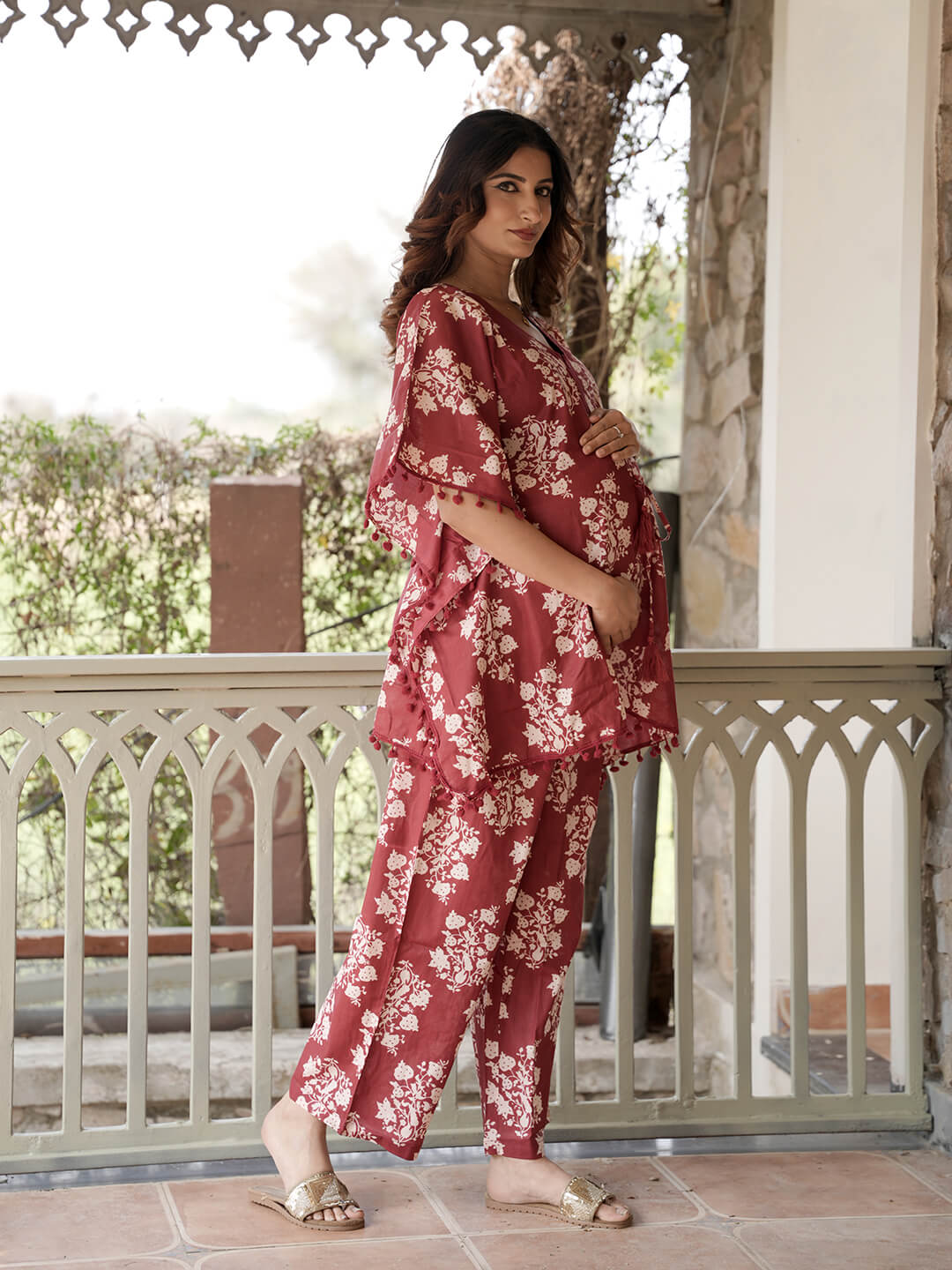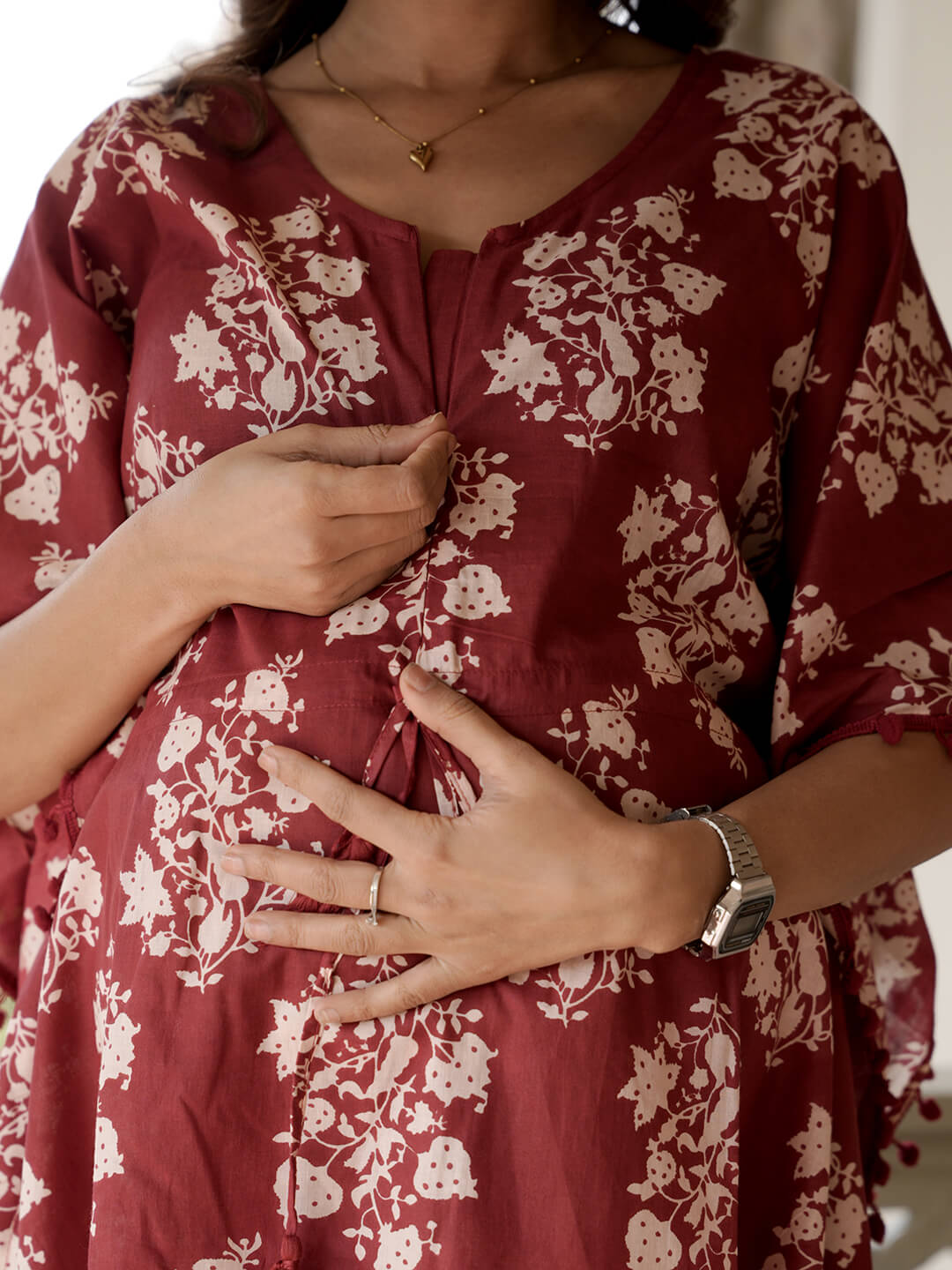 Maroon Printed Cotton Maternity Feeding-Friendly Kaftan Night Suit