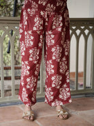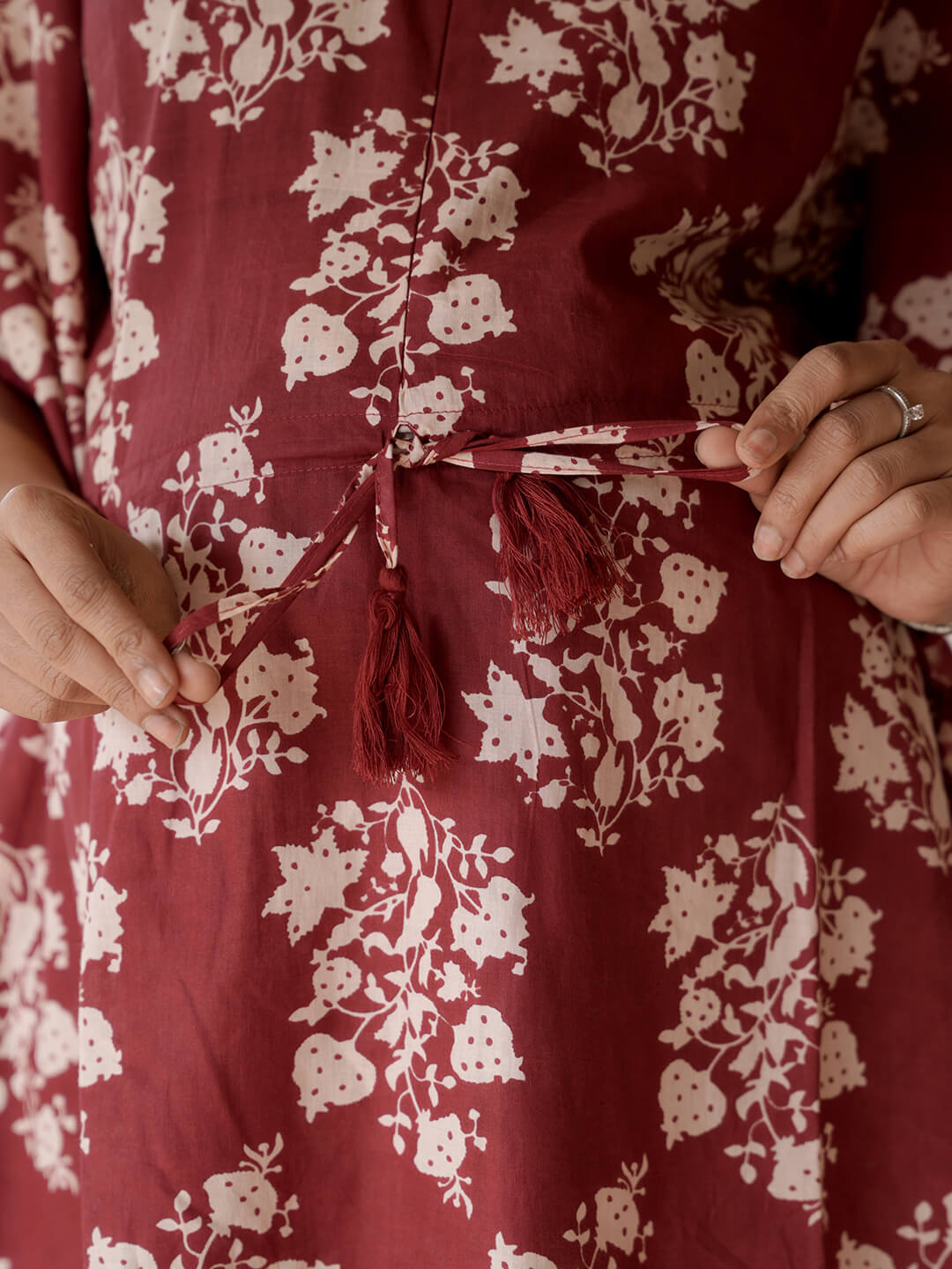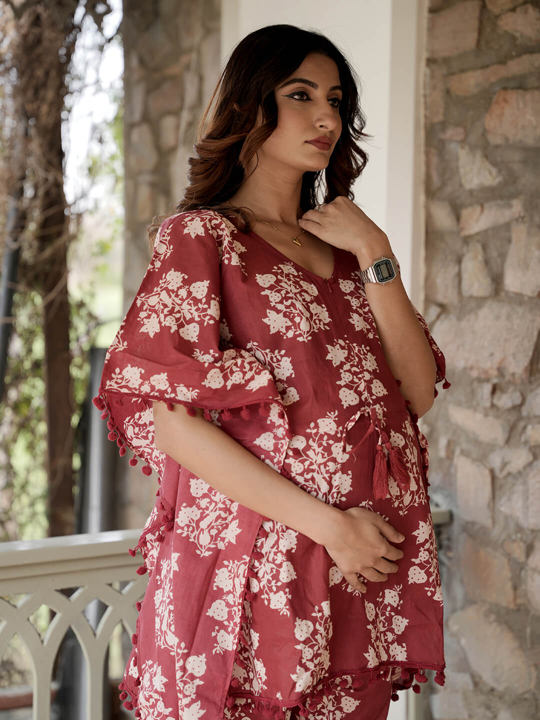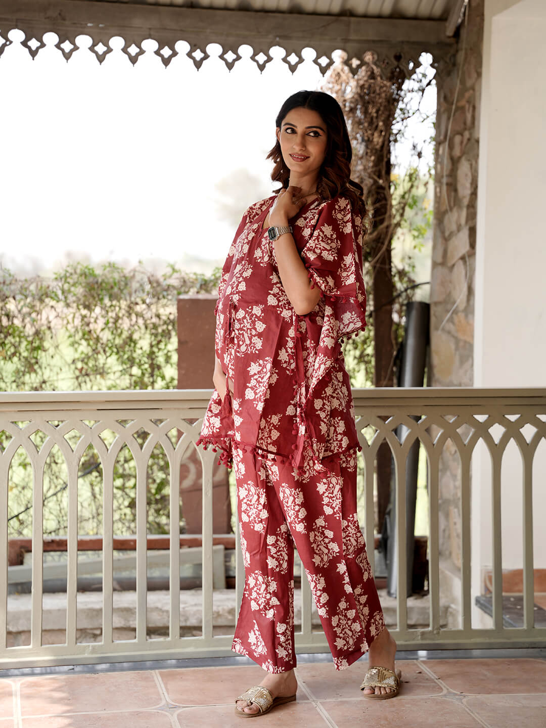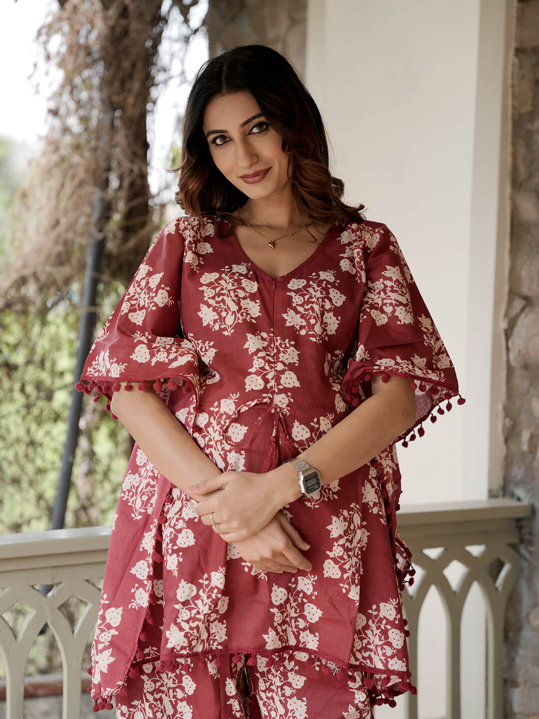 Maroon Printed Cotton Maternity Feeding-Friendly Kaftan Night Suit